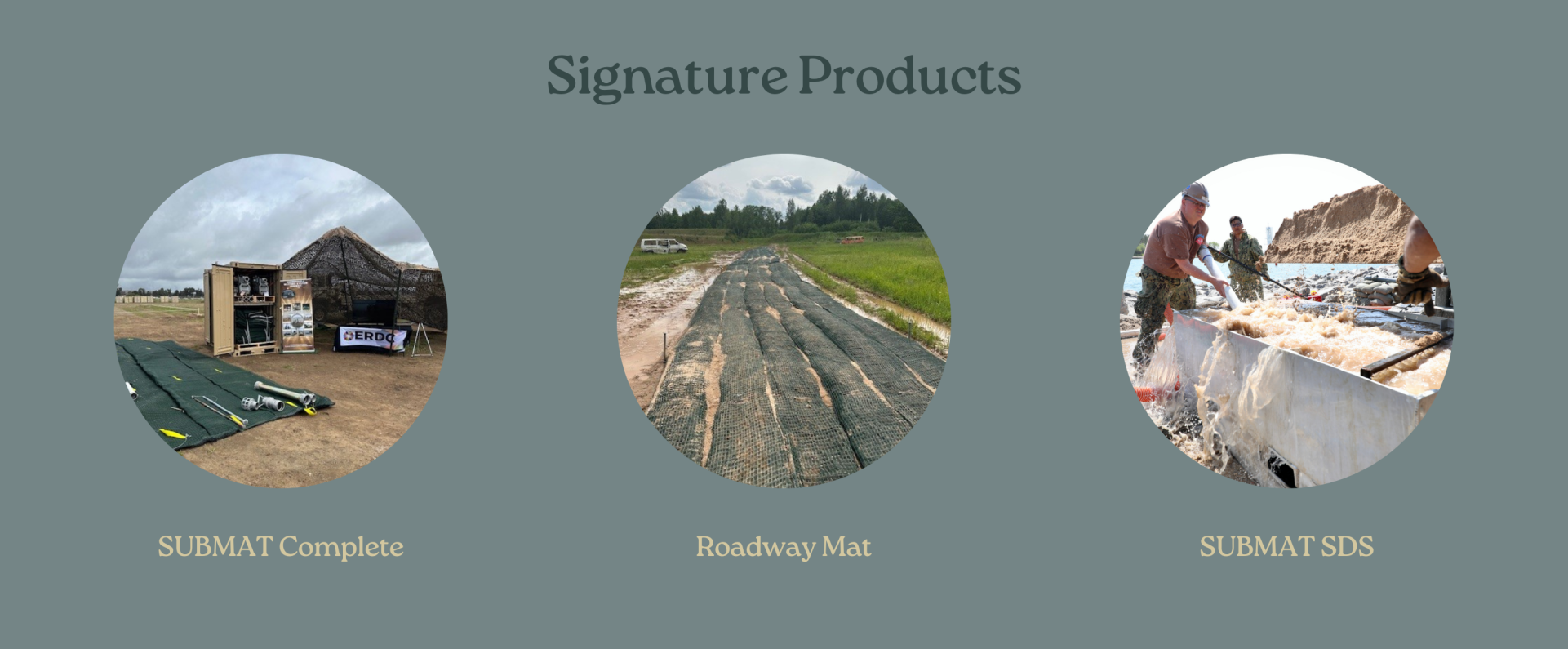 Submersible Matting System or SUBMAT is a patented matting system made from readily available geotextile products. SUBMAT uses either indigenous or imported granular materials to create a stable driving surface for logistical and landing operations.